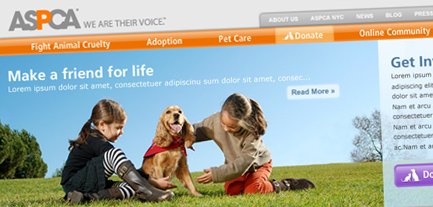 PROJECT: Website redesign for the American Society for the Prevention of Cruelty to Animals. The primary goals for the redesign was to promote online donations, create an online community, and clearly present ASPCA's mission toward animal welfare.