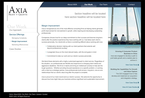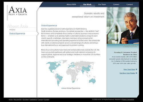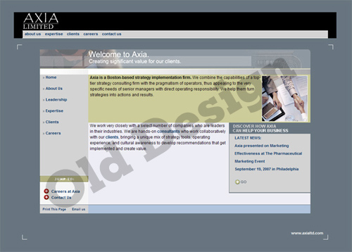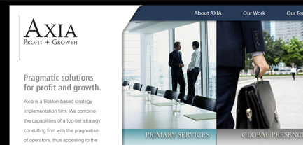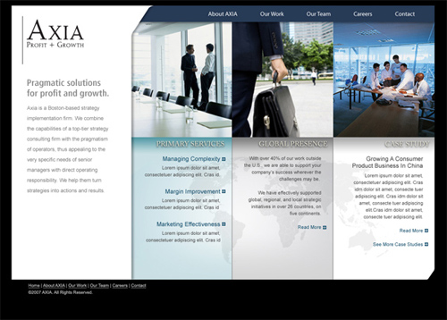 PROJECT: Axia is a global consulting firm dedicated to helping companies sustain growth and profitability. This design presents AXIA as a global leader by putting forward their services and expertise in a clean and professional design.