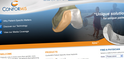 PROJECT: ConforMIS, is a company that offers patient-specific knee implants and instrumentation. The website was designed to target ConforMIS's two very different audiences, doctors and patients. Depending on the user path taken, the imagery and information will be tailored to that audience type.