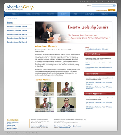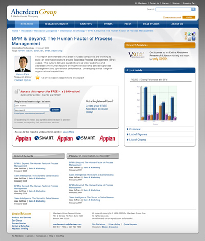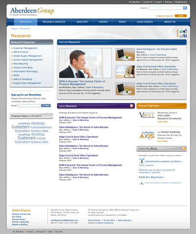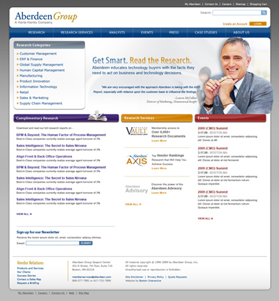 PROJECT: Aberdeen is a research company focused on delivering fact-based research to help educate technology buyers in making profitable business decisions regarding today's technology. Aberdeen needed a new website design to help organize and streamline their prospective users and existing members to purchase reports and to build a larger community of user.