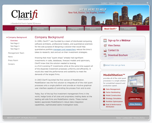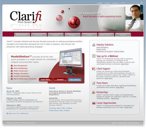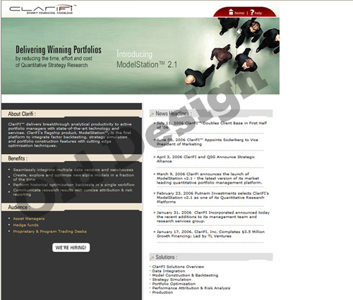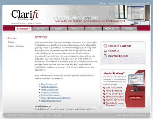 PROJECT: Clarifi is a software company which targets investment managers and helps them research, test, and launch investment strategies. This website design organized their software solutions and clarified the product benefits to their new and existing clients.